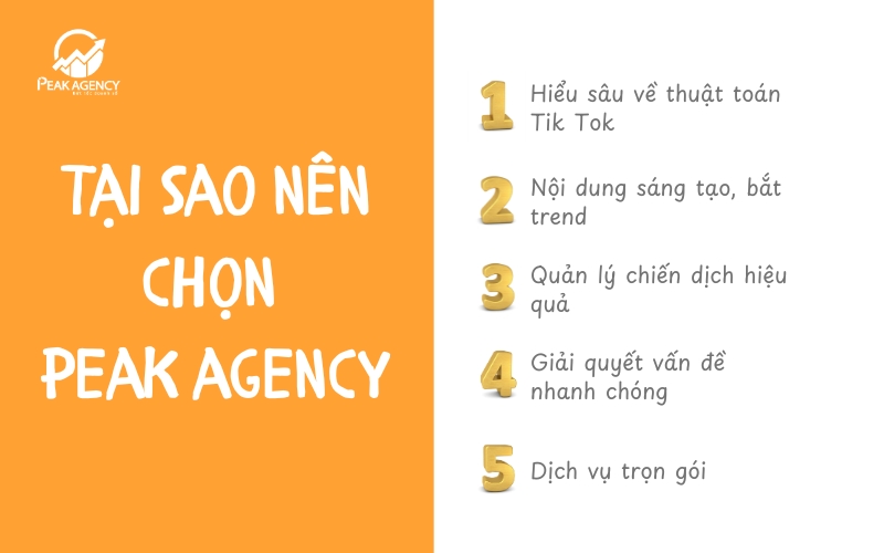 Để tiết kiệm thời gian và đảm bảo hiệu quả, bạn có thể cân nhắc dịch vụ quảng cáo TikTok của Peak Agency